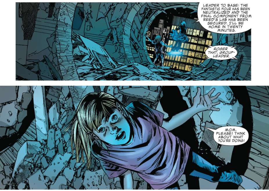 Deneuve uses her power to punch yet another hole in the building. She contacts her people, saying the Fantastic Four have been neutralized and that she has secured the final component for the plan. She instructs Valeria to tell the FF not to look for her. Valeria calls Deneuve “Mom,” and asks her to think about what she’s done. Then Deneuve throws off her coat to reveal a futuristic Fantastic Four uniform underneath. Yes, this is Sue from the future, and the New Defenders’ leader. She says, “I’ve had five hundred years to think about it, darling.”