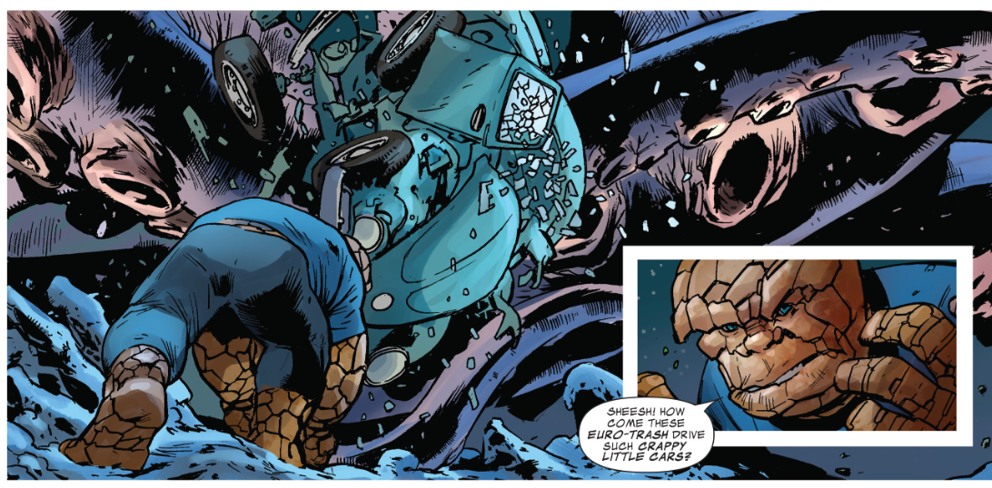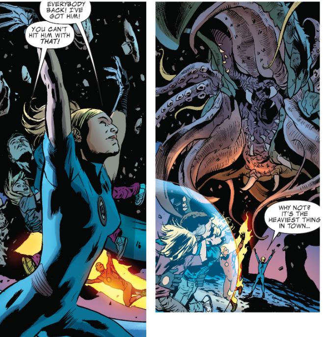 More fighting, with Ben throwing Rhona’s car at the monster. The creature is fireproof, but Johnny slows it down by melting the ground under it. Franklin then comes up with a plan. Using Valeria as bait (!) he gets the monster to follow him into the FF’s new TARDIS-style bigger-on-the-inside Fantasti-carrier, which is big enough to contain it. It only works for a few minutes, though, as the monster breaks through the carrier and keeps rampaging. Sue then says she’s going to hit the monster with the heaviest thing in town. Using her force fields, she drops the town church on the beast.
