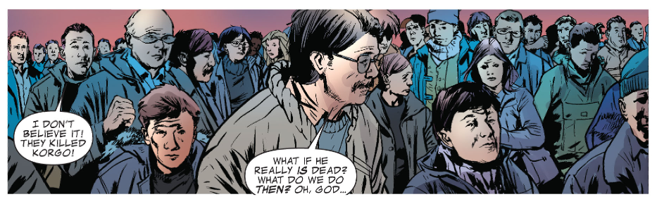 With the fight over, the townsfolk gather. One local says, “They killed Korgo!” and another says, “What do we do then?” A cop explains that the town has no crime, sickness, or death, and that’s not a coincidence. Hamish adds that Korgo protected the town for thousands of years, and all it needed was the sacrifice of an innocent child one Christmas morning every twenty-five years.