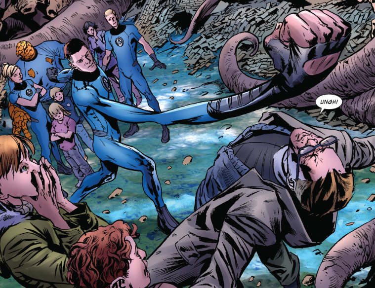 Hamish says Korgo wanted to take his son Hamish, but he somehow arranged for Valeria to be the sacrifice instead. Reed responds by stretching his hand into a huge fist and punching Hamish unconscious. Ben’s fiancé Debbie, who’s been hanging back during all this, says, “We are so going to my parents next year.”