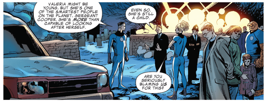 The FF have traveled to Scotland to spend Christmas with Reed’s never-before-seen cousin Hamish and his family. There are hints that something strange is going on in this small town. Then, on Christmas morning, little Valeria goes missing in the woods. This issue begins with the search for her, as local law enforcement work with the FF and Hamish to find her. Johnny and Ben comb the forest while everyone else does a townwide door-to-door sweep. Hamish blames himself for what happened, but Reed says the FF are magnets for stuff like this. “Wherever we go, the madness just follows,” he says.