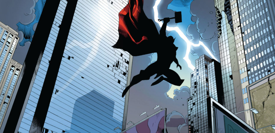 In the Savage Land, we see some of the old-timey heroes revealed as Skrulls when Black Widow shoots and kills them (!). She attacks the Spider-Woman Skrull, who retreats and leaves Black Widow alone with Iron Man. Black Widow assures Iron Man that he’s not a Skrull, and that the Empress was just messing with him. Back in NYC, the battle gets more and more out of control, with civilians being endangered. There’s a bolt of lightning. Thor and Captain America appear in the sky overhead.