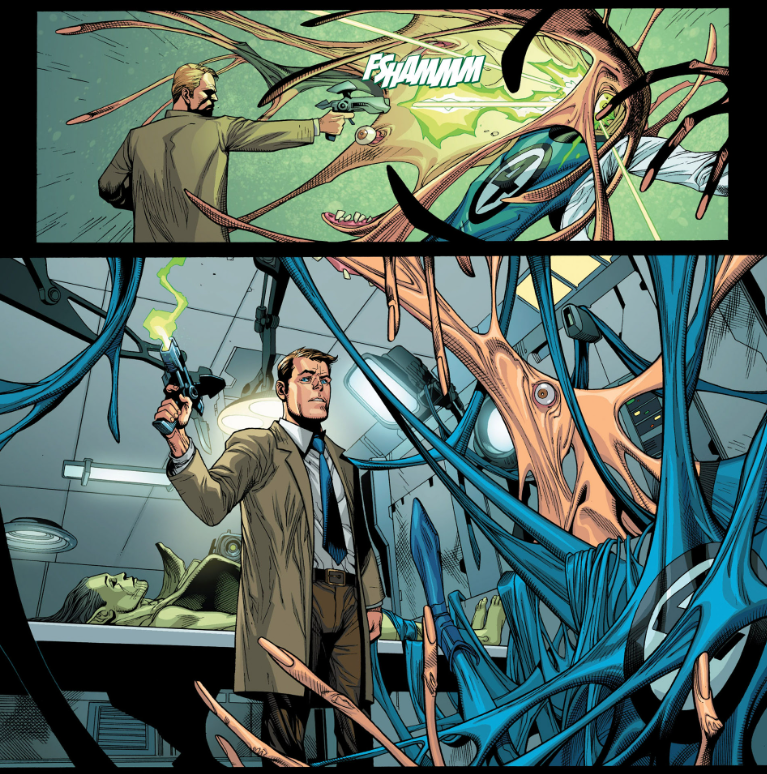 In space, Agent Brand of S.W.O.R.D. survived the bomb in some kind of shield/bubble thingie, and she spots a huge fleet of alien warships flying past the moon toward Earth. At Avengers tower, Reed is still working on the autopsy when Hank Pym pulls a gun on him. Hank is really a Skrull, and the gun stretches out Reed to make him look like chewed gum or something.