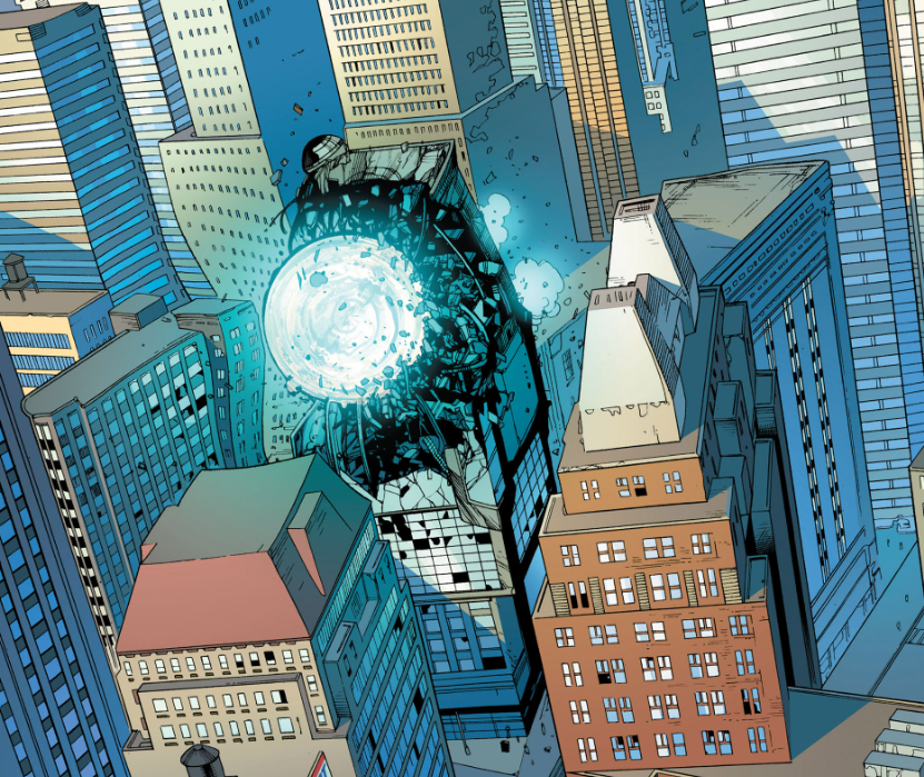 And it’s not just Iron Man. The virus runs rampant through all the Stark International buildings and tech, it downs a S.H.I.E.L.D. Helicarrier, and it frees all the villains in super-prisons the Raft and the Cube. A Skrull impersonates Sue Richards to get into the New Baxter Building and free all the villains inside the Negative Zone prison, which is still a thing since Civil War. There’s an exterior shot of the Baxter Building getting absolutely wrecked by the Negative Zone portal.