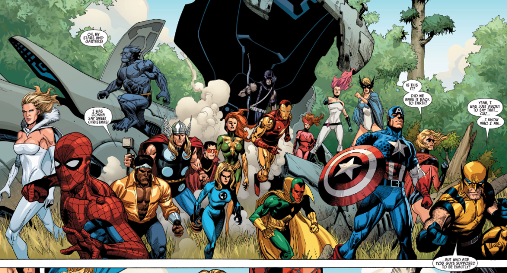 Back in the Savage Land, Iron Man suffers a seizure due to his armor’s malfunction. Then the Skrull ship opens and a whole bunch of Marvel heroes come out, wearing their costumes from years earlier. They claim to be the real ones, taken off Earth some time ago, blaming the current Avengers for being the imposters.