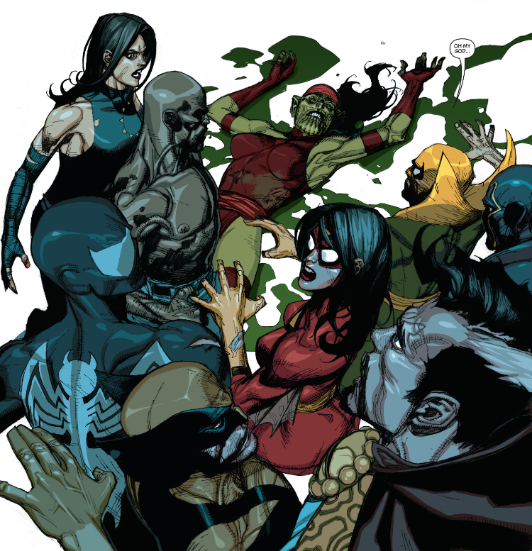 The event began in New Avengers #31. This was during a big shakeup for the team. Elektra had taken over as new leader of the Hand, and now commanded her own army of ninjas. She and the Hand had the Avengers on the run, with a plot to brainwash the Avengers to do her bidding. Most of issue #31 is the Avengers battling ninjas inside a Japanese castle while Dr. Strange and Echo fight to overcome the brainwashing. Echo ultimately succeeds, and then she stabs Elektra through the chest as vengeance for Elektra doing the same to her a few issues earlier. The fight stops, and there are two pages of everyone reacting in shock. We finally reveal that Elektra was a Skrull the whole time! The issue ends as Iron Fist asks, “What does this mean?” and his question goes unanswered.
