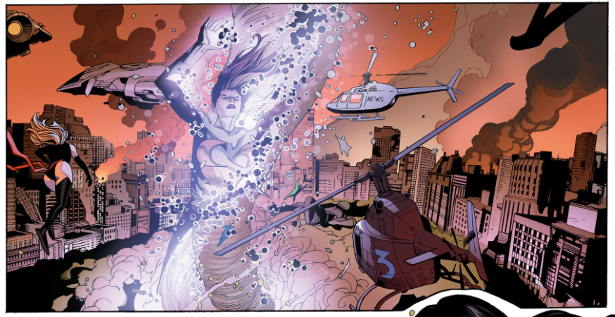 Jessica Jones watches from a distance. She leaves her baby Danielle with Jarvis (not knowing this Jarvis is a Skrull) to join the fight. Then Noh-Varr flies into the city, landing with a huge boom. He proclaims, “This fight is over!” Jessica reunites with Luke Cage, Kate Bishop is injured, the Empress electrocutes Wolverine. Hawkeye takes a big shot, successfully arrowing the Empress. Then the Hank Pym Skrull, despite his sniper injury, enacts the backup plan. Wasp has a flashback of Hank (the Skrull) giving her a new growth formula to give her giant powers as well as shrinking ones. Wasp grows to giant size, unleashing some sort of dark energy onto all the heroes.