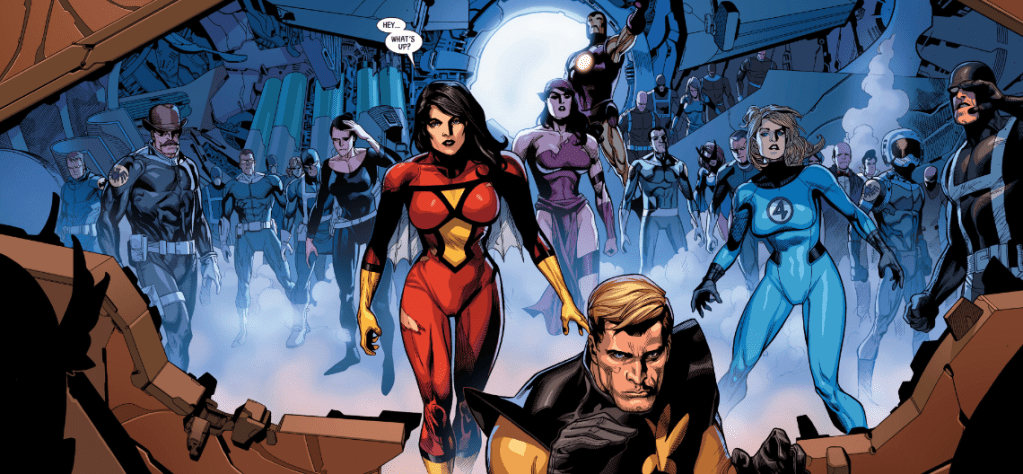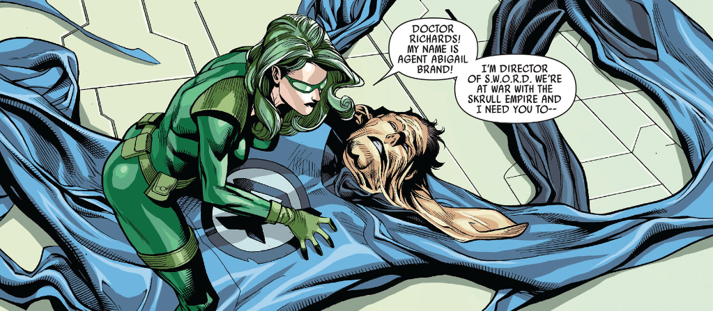 Recap: The Skrulls having been living in secret among the Marvel heroes for a while, led by the Skrull Empress in place of Spider-Woman. As they’ve revealed themselves, the New Avengers are separated while fighting Skrulls in the jungles of the Savage Land, and a Skrull battleship unleashes hell over New York City. A Skrull posing as Sue infiltrated the new Baxter Building, seemingly destroying the top half of the building by opening the Negative Zone portal. Reed was captured by a Skrull impersonating Hank Pym and locked up inside one of their ships. When Agent Brand of S.W.O.R.D. (the outer space version of S.H.I.E.L.D.) got blasted into space, she ended up on board that same ship.