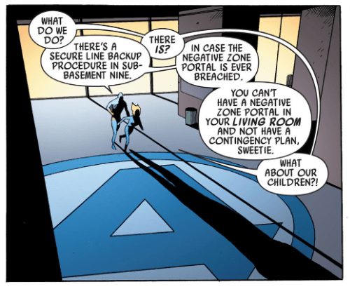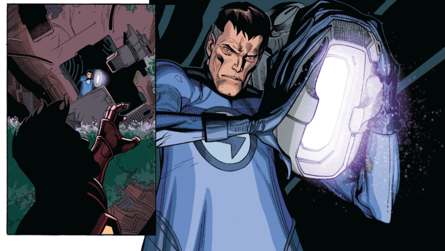 Clobberin’ time: Ben’s suggestion on how to restore the Baxter Building is just him saying “Press the blue button” over and over. Reed’s actions suggest that it’s a little more complicated than that.