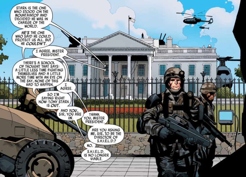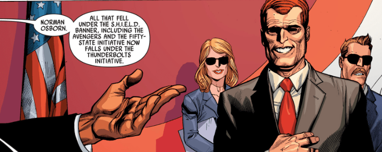 Then the status quo change. At the White House, the US President says this invasion, combined with the heroes all fighting each other during Civil War, means that Tony Stark is out as head of S.H.I.E.L.D. Not only that, but S.H.I.E.L.D. is being shut down permanently, in favor of a newer and more modern organization. The whole world watched the news cameras record the New York battle on live TV, and saw a new hero save the world. Marvel’s new number one superhero is… Norman Osbourne!!!