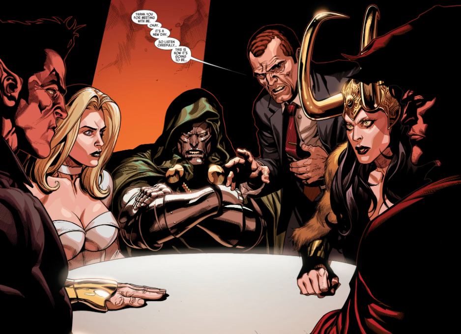 The President further explains that Osbourne now has complete control of whatever this new S.H.I.E.L.D. replacement will be, as well as the New Avengers, and the Thunderbolts, and the entire Fifty States Initiative! Osbourne promises a full investigation into Stark Industries to root out any criminal negligence. Later, at Avengers Tower, Norman opens a secret door. Inside, he has assembled his own version of the Illuminati, with Dr. Doom, Namor, Loki, Emma Frost, and the Hood. He says, “It’s a new day,” and “This is how it’s going to be…” And just like that, without so much as taking a breath, Dark Reign begins on the same page that Secret Invasion ends.