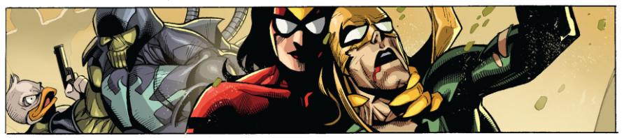 There’s a lot of catching up, and everyone’s still a little suspicious of Spider-Woman. The villains run off. Hawkeye and Mockingbird share a kiss, while Nick Fury silently turns his back on Maria Hill. When Jessica Jones sees Jarvis among the survivors, she realizes that she left baby Danielle with a Skrull. Jessica, Carol Danvers, and Luke Cage fly to their apartment to discover Skrull Jarvis and the baby are gone.