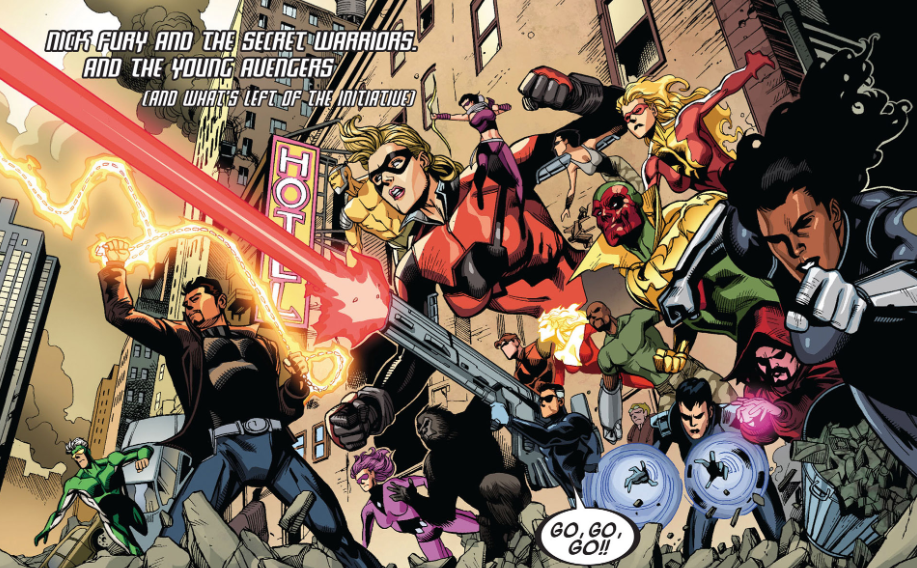 There’s a big standoff at Central Park with the Skrulls on one side, and the New Avengers, Thunderbolts, Young Avengers, and Howling Commandoes on the other side. Reed does most of the talking, saying the Skrulls aren’t there to save the Earth, but to destroy it out of petty revenge. The Empress says, “He loves you,” which is something the Skrulls have been saying throughout all this. She adds that “he” refers to “God.” Stark has had enough. He does the ol’ “Avengers Assemble!” and the big fight breaks out.