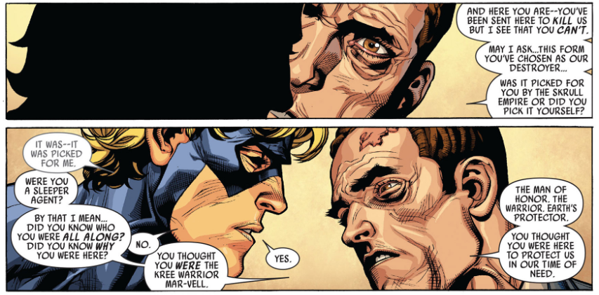 Issue #6 has the Mar-Vell Skrull tracking down Noh-Varr, a.k.a. Marvel Boy, who is a Kree. The Mar-Vell Skrull says the Skrulls have no honor, willing to lie or kill their fellow Skrulls to get to Earth. He says his time as a sleeper has shown him how good the Earth is, and he urges Noh-Varr to fight on Earth’s behalf.