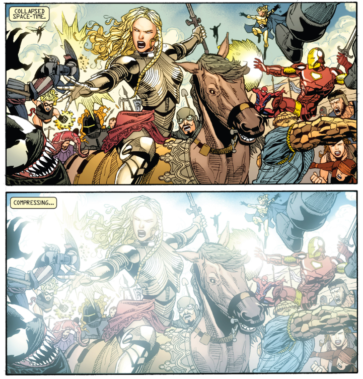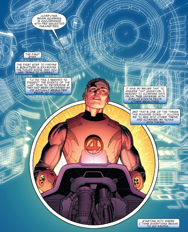 Inside the Bridge, we see Reed mapping out other universes where recent Marvel events went differently. Valeria gets the power back on, after which the dinosaur world seems to fade away as the caption states, “Variable space-time compressing…” Reed determines that only 418 alternate versions of the superhero registration act resulted in a peaceful solution. He tells the Bridge computer to feed those directly into his brain (!). He deduces that every nonviolent solution to Civil War resulted when Iron Man’s involvement was little to none.