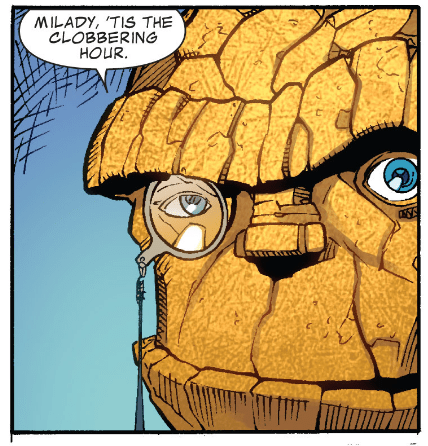 Inside the compressed space-time, we see an Elizabethan England type of setting, with Sue sitting on a throne, surrounded by old-timey versions of other Marvel heroes. She learns there’s a peasant rebellion in the works, led by “a man with an iron heart and a silver tongue.” Outside the castle, we see Elizabethan Tony Stark talk about fighting for fairness and equality. He initially brags about being nonviolent and enlightened, only to draw a sword and says he will fight if dialogue fails. He leads his team of old-timey superheroes in chanting, “Republic! Republic! Republic!”