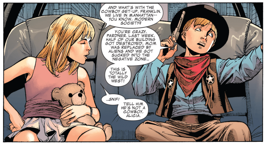 Four and a half: Franklin spends these issues dressed in a cowboy costume he bought on the family’s shopping spree. My guess is he’s acting up in dealing with his little sister being revealed as a super-genius.