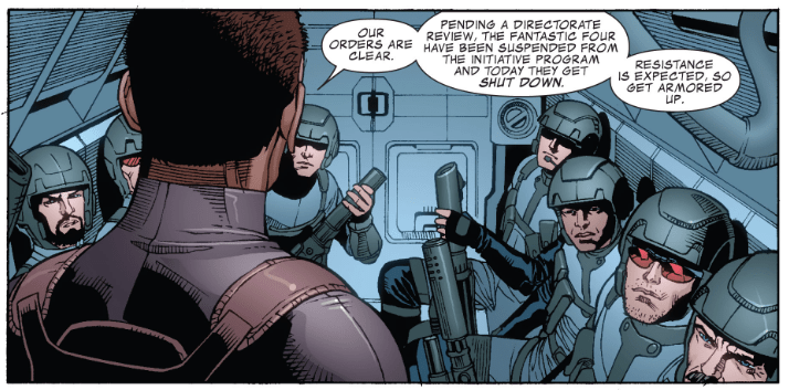 Then a bunch of military vehicles pull up in front of the Baxter Building. Norman Osbourne is inside one, giving orders to H.A.M.M.E.R. troops. He says the Fantastic Four are suspended from the Initiative, and today they’re being shut down. “Resistance is expected,” he says.