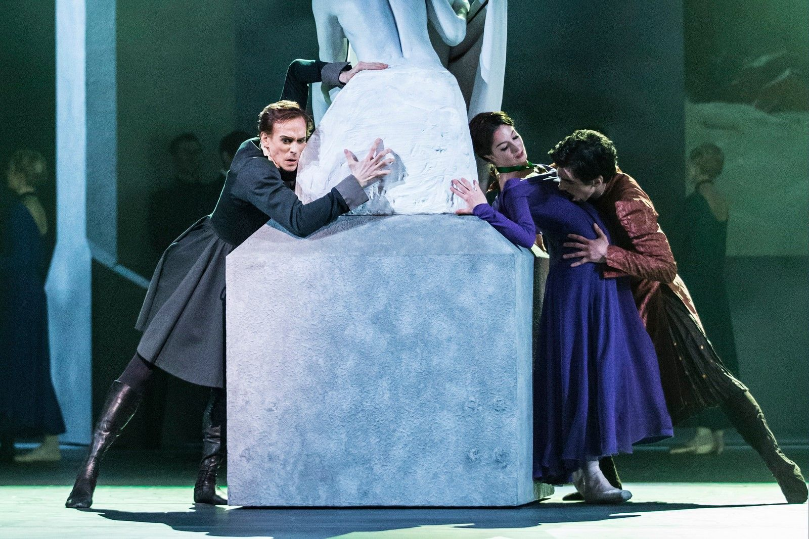 We’re in the final stretch of the super-long Act 1 Scene 2, when Polixenes returns to the stage. He says one of my favorite lines from the play, “My favor here begins to warp.” Catchy wordplay aside, this means he can tell something is up, and that he’s not as welcome in Sicilia as he was when this scene started. If this were a full-on movie adaptation, I imagine we’d be in a different location now, with visual cues to show that some time has passed.
