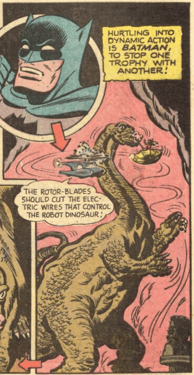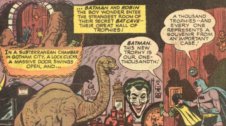 Continuity! As Batman and Robin look through all their trophies, they reference the cases the trophies came from, and each of these corresponds to a previous Batman comic. The DC Wiki has the complete list, so I won’t repeat them all here. What’s missing is the giant Joker playing card, even though it should be here because it was established as part of the Batcave in Detective Comics #114 in 1946. A Joker mask, however, is seen as a trophy in this issue.