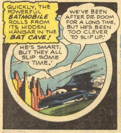 Gordon, via the Batmobile’s radio, tells Batman that a “smuggling-leader” named Dr. Doom was spotted at Gotham City’s Pier 16, where a ship, the Queen Maude, has just arrived. Batman says he’s been pursuing Dr. Doom for a long time, but the villain has been too clever, so that Batman can’t nab him in the act. At the docks, we get our first very tiny glimpse of Dr. Doom: