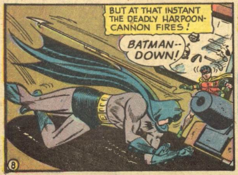 As the heroes investigate, the container holding the giant dice activates, throwing the dice at Batman. Batman ducks out of the way while Robin deduces the dice mechanism had a cut wire. Then the giant penny almost drops on Robin, and the harpoon gun fires at Batman. Fortunately, our heroes are skilled enough to avoid these dangers.