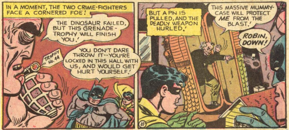 Then the dinosaur attacks, under Doom’s control. It fights Batman and Robin on the giant chessboard, for some classic Silver Age whimsical weirdness. Batman uses the experimental helicopter to fight the dino, cutting the wires that control it. With the dinosaur now useless, Doom escapes it and grabs a grenade, which is trophy #44. He pulls the pin, despite Batman’s warning that it could destroy them all. (Batman didn’t disarm this thing before he put it in the trophy case?) Doom hurls the grenade to the center of the room while he hides safely inside the mummy case.