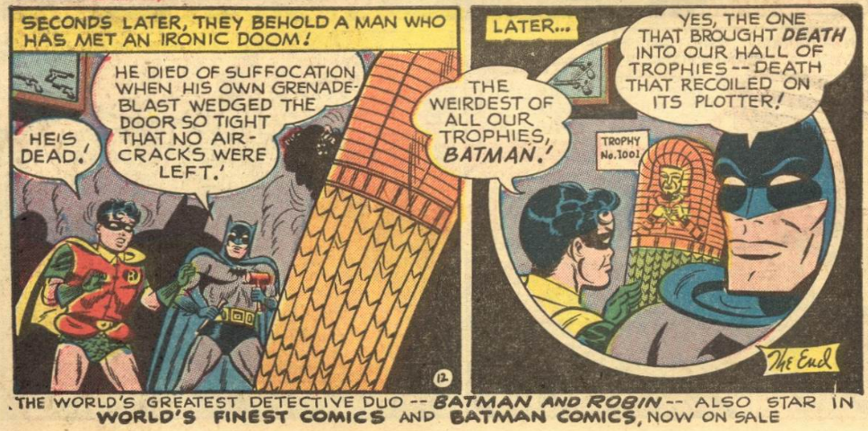 Batman smothers the grenades blast by using another trophy, a small mansion that was once home to a group of miniaturized people. Batman says now that Dr. Doom is inside the mummy case, they know where he is, and they can take him to the police. But then, Batman discovers that the grenade blast sealed the mummy case shut, with no air inside. Batman tries to chisel the mummy case open, but it’s no good. He can’t get it open, and Dr. Doom suffocates to death (!). The mummy case, with Doom’s corpse inside it, is placed inside the Batcave as trophy number 1,001. Batman ends the story on a grim note when he says, “The one that brought death into our hall of trophies – death that recoiled on its plotter!” (And people say these Silver Age comics were all kid-friendly and squeaky-clean.)