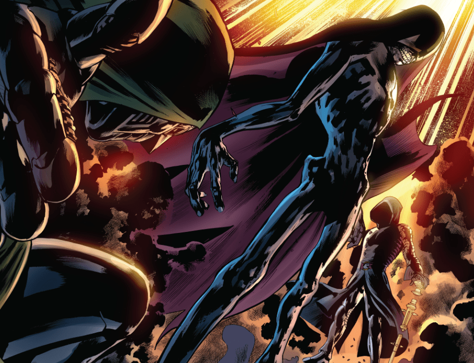 Sue joins Reed at the Baxter Building as he performs an autopsy on the Watcher. He goes back on what he said earlier, in that this is not Uatu, the Earth’s Watcher, but an Uatu from a parallel dimension. Sue concludes that this had to do with Doom’s recent threats that something huge is on its way. They speculate on who Doom’s teacher might have been, and that this dead Watcher might have seen something he shouldn’t have. In Latveria, there’s more celebrating in the streets as Doom’s master is about to arrive. He warns his attainers to shield their eyes, and he welcomes “the Marquis of Death and the new apprentice.” And here they are: