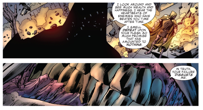 The Marquis tells Doom to ask his question. Doom doesn’t know what question that is, and Marquis says the question is whether he’s happy with Doom’s progress at becoming the greatest villain who ever lived. The Marquis says the answer is “No,” and causes explosions to happen all around. The Marquis says he can hear and smell all the times Doom has been defeated by his enemies. He concludes, “Your foes deserve a new menace, Victor.”