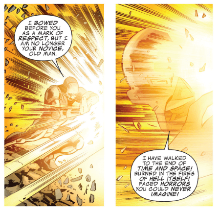 After wreaking murderous havoc throughout the multiverse, Dr. Doom’s long-lost master, the all-powerful Marquis of Death, has arrived on Earth with his apprentice. The Marquis expressed disappointment in how Doom has not yet conquered the Earth, so he engulfed Doom in a burst of flame. This issue begins by showing us that Doom is not fazed by this. He says through the fire, “Is that the best you can do?”