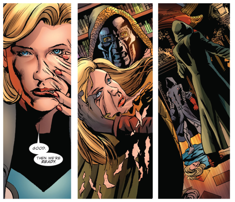 Sue asks Doom if he’s happy, and if this life he’s built for himself makes him feel content. He says, “For the first time in my life.” Sue answers “Good. Then we’re ready.” She peels off her face to reveal she’s the Marquis in disguise. Doom says the Marquis died five years ago, but the Marquis says not even five seconds have passed. And just like that, we’re back at the start of the issue, with Doom on his hands and knees burning up in the fire.