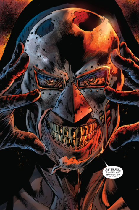 Back in the present, the Marquis says he’s disappointed, and that he hoped for better from Doom. The apprentice says it’s time to initiate the slaughter, and destroy the Earth like all the worlds they’ve destroyed. Instead, the Marquis says his honor must be restored by rectifying his failure with Doom. He says this begins with the Fantastic Four. The Marquis picks up Doom’s mask and puts it on his own face, saying “Let us see how they fare against the new Doctor Doom.”