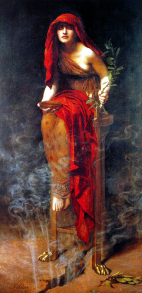 By most accounts, there was more than one oracle over the years, each one taking the name Pythia upon getting the job. Apparently, there are some early stories where Pythia is a male goat-herder (!) wandering about the fields. But for the most part, Pythia is described as a virginal young woman. This version of Pythia is described as sitting on a high chair, sometimes strapped or even chained to the chair, as magical mists or clouds surround them, giving her the gift of prophecy.
