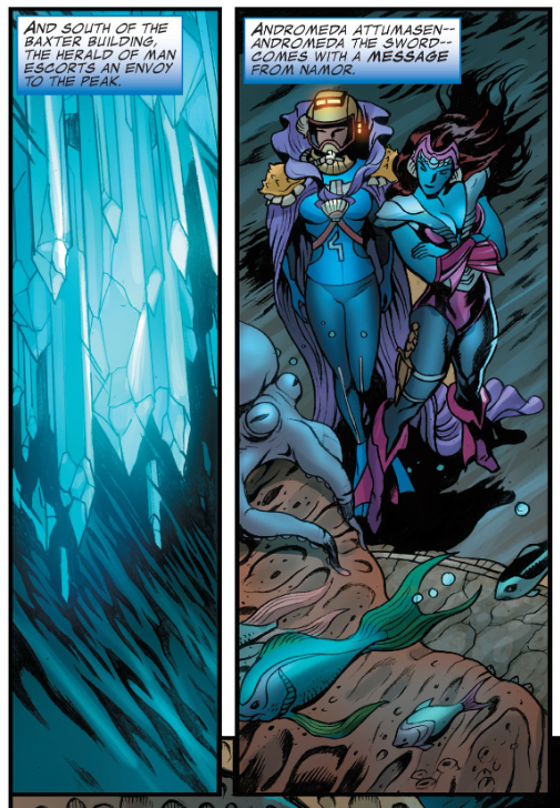 Fade out: Sue doesn’t say anything during the meeting between Atlantis and Old Atlantis, but the caption emphasizes her importance there as “the herald of man.”