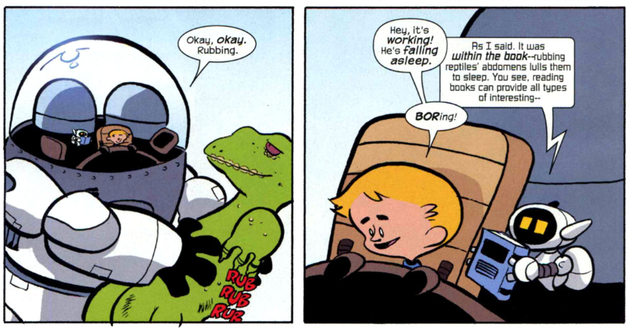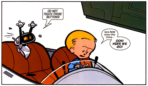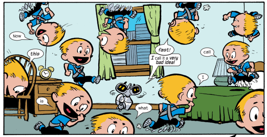 Son of a Genius, from writer and cartoonist Chris Eliopoulos, started as some backup comics appearing in the 2000s non-canon revival of Power Pack. These were then reprinted as standalone comics, which proved successful enough for Marvel to produce even more standalones. The setup is simple. Franklin is a precocious kid and H.E.R.B.I.E. is his overprotective robot nanny and overall voice of reason. Franklin helps himself to an invention of his dad’s, leading to comedic mishaps. Everyone in the world compares this to the legendary Calvin and Hobbes newspaper strip. But aside from similarities in the art, they’re not that alike.