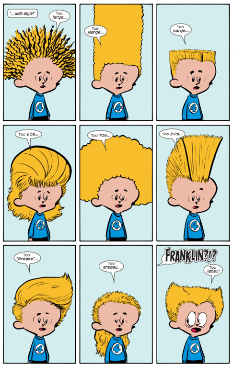 – “Gravity Depravity.” Wanting to be like Spider-Man, Franklin uses a gravity machine to be able to walk on walls. It breaks the fourth wall by sucking the panel frames into a gravity well, only to reset to normal because the law of gravity can’t be broken.