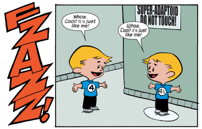 – “Double Trouble.” Franklin encounters a new version of the Super-Adaptoid, which transforms itself into a second Franklin. The clone runs around causing chaos in Franklin’s life that he then has to catch up to. This story is the series at most Calvin and Hobbes style, referencing the story where Calvin cloned himself. It also confirms that Franklin’s crush Katie is in fact Katie Power of Power Pack.