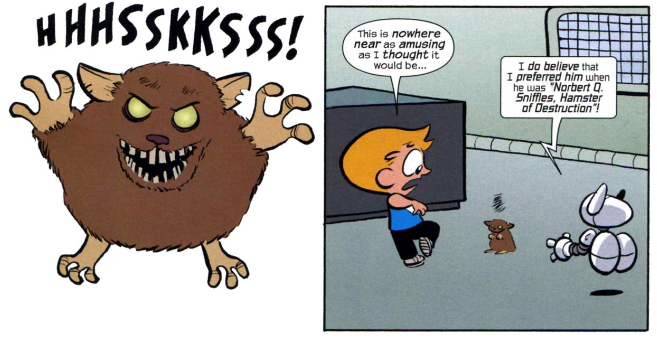 – “Hamster Havoc.” Franklin’s parents give him a pet hamster. He really wanted a dog, though, so he puts the hamster in a “transmutanator” to turn it into a dog. It backfires, growing the hamster to Godzilla size. H.E.R.B.I.E. replicates an equally giant hamster wheel for it, and then they shrink it back.