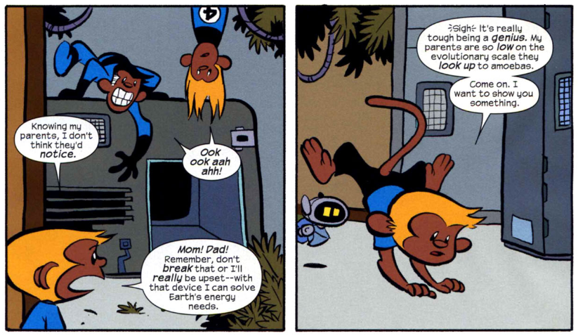 – “Chimp Change.” In this alternate universe, everyone is a chimp. Chimp Franklin confronts a chimp version of the Mole Man.