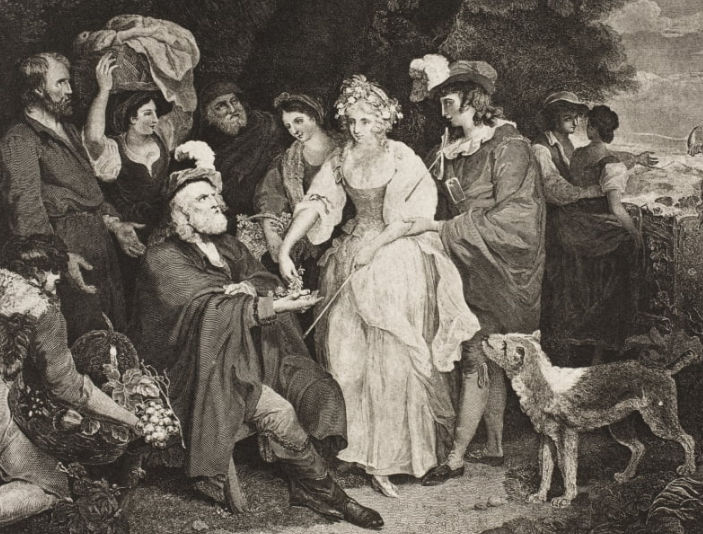 We just got to know young lovers Perdita and Florizell, and now they’re joined on stage by a whole crowd of other characters. This includes the shepherd, who is Perdita’s adopted father. He gives a fun speech filled with fun wordplay about how his departed wife (Perdita’s adopted mother?) was a great hostess at events like this, and how she should be less of a guest and more a hostess to the others. Among the guests are the king, Polixenes, and former Sicilian lord Camillo, both in disguise. Also here are Mopsa and Dorcas, two shepherdesses.