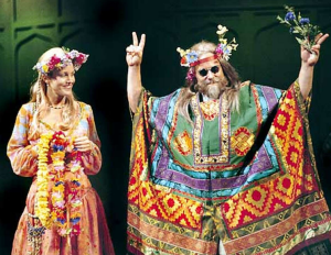 Perdita has an odd line about not painting her face, so that others are only attracted to her via artificial beauty. She compares this to the authenticity of the flowers she grows in her garden. She next offers him marigold, which she described as opening and closing its pedals in accordance with the sun’s rising and setting, while weeping with morning dew. She says it’s a flower for middle summer, and that he’s “middle aged.” I’m unclear on what middle aged meant in Shakespeare’s day, but that line probably gets a big laugh with today’s audiences.
