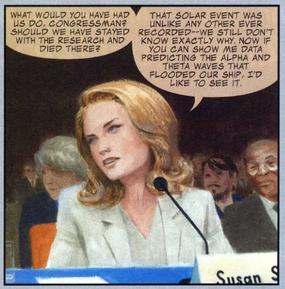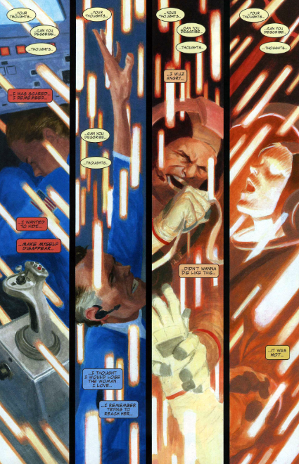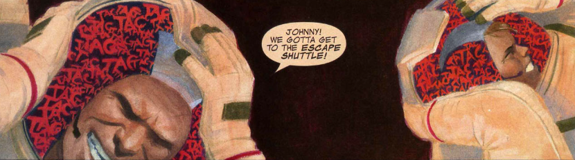 Back in the present, one of the politicians asks Ben if the station’s communications could have predicted the solar event. Ben, whose monstrous rocky hide is partially hidden under a hat and trench coat, does not say anything in response. In the flashback, there’s a lot of action, as the station is wrecked by the solar event. Sue tries to hide, while Reed struggles to reach her. Ben was angry and didn’t want to die, and Johnny could only think of how he felt like he was burning up.