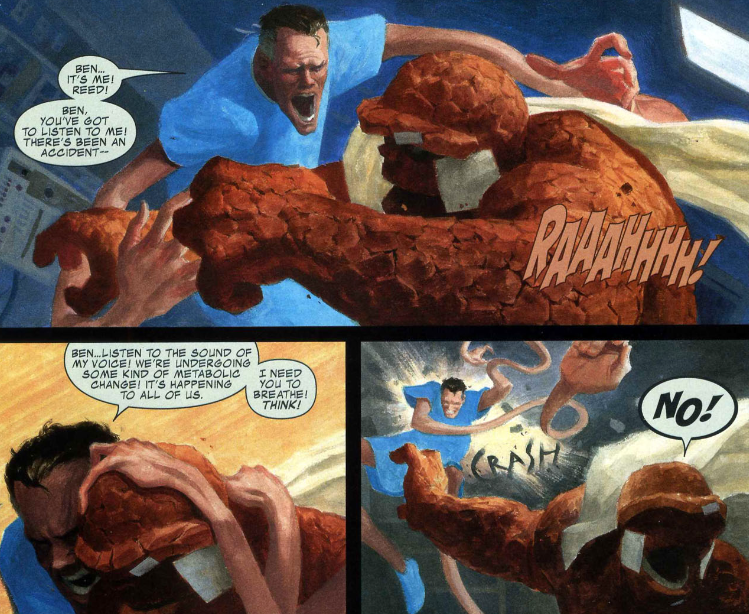 Cut to a hospital, where Sue and Reed observe with fear as Ben is in a coma while doctors run Johnny through a series of tests. Ben wakes up and freaks out upon seeing that he has become a monster now. There’s a lot of action as he trashes the hospital while the others try to calm him down. This activates Reed’s and Sue’s powers in response. They get Ben to calm down, only for Johnny to burst through the door, fully flamed on.