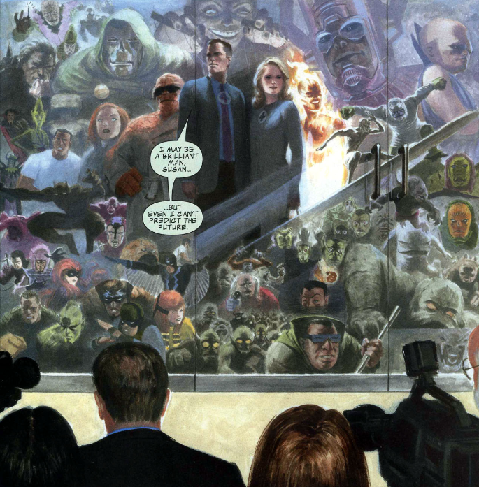 In the present, the politicians say Ben is dangerous because of the damage done to the hospital. He says it’s because he was scared, and that anyone would have acted the same way. Reed says that no matter what these powers are or where they came from, the four of them will use them only for the right reasons. As the four of them leave the hearing, Sue asks Reed what will become of them. We get an image of the FF with a lot of their villains and supporting characters in the background, and Reed says, “Even I can’t predict the future.”