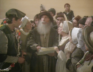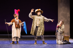 The peddler enters, and of course it’s Autolycus (the king of thieves!), here to enact his sneaky plot from act 4 scene 3. The stage directions note that he’s wearing a false beard. Most productions will make this beard very obviously fake, for a big laugh. He performs a song that lists all the items he’s selling as a peddler, along with the uses for each item. The list is jokey and broad enough that an actor could probably go ahead and say the lyrics rather than sing them outright, if needed.