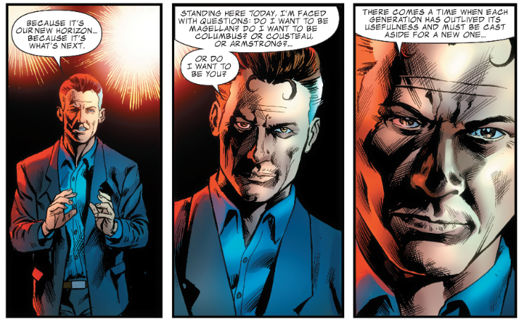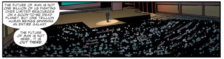 We begin with Reed speaking at the Singularity Conference. He said when this annual conference started ten years earlier, it was just a few scientists with a plan to solve not just today’s problems, but the future’s. It has now grown into a huge event with its own campus in Colorado. Rather than praise the scientists, though, Reed criticizes them for growing too old and stale, and not thinking big enough. Rather than debate population control, Reed urges them to look to the stars. He announces his resignation as a member, saying there are more discoveries to be made.
