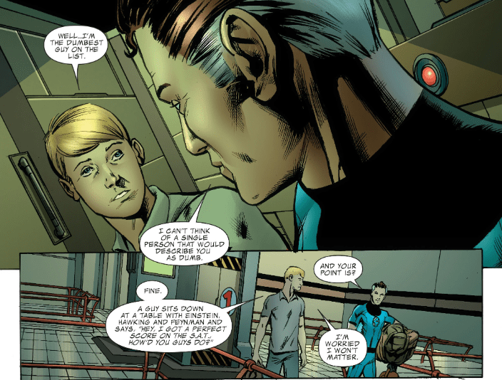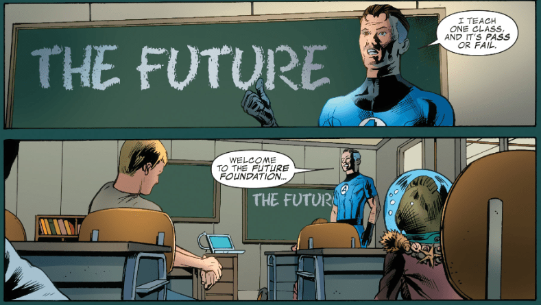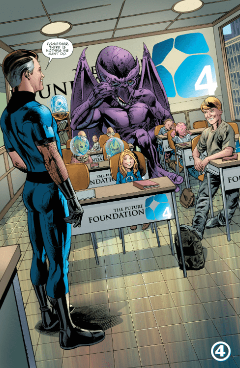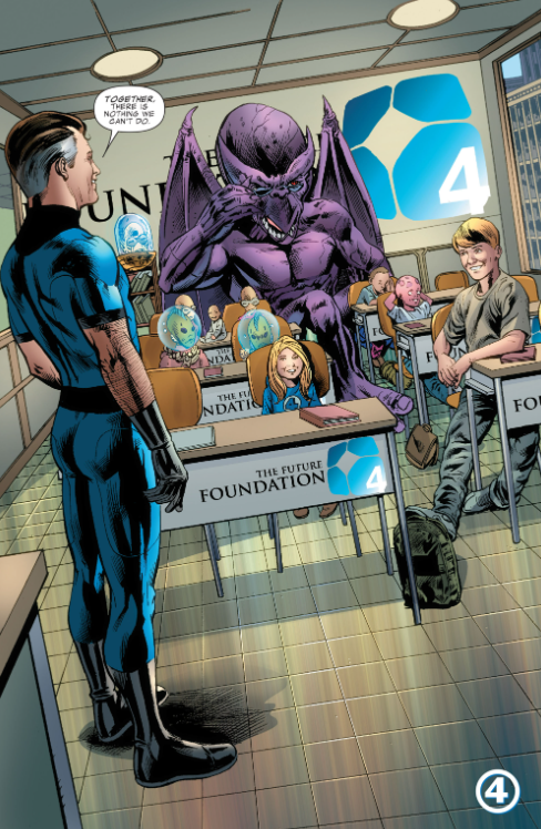 At the Baxter Building, Reed has set up a classroom. He says to his students that there will be only one class in this school, and it’s pass or fail. He says, “Welcome to the Future Foundation,” and “Together, there is nothing we can’t do.” And with that, we see our new team, the Future Foundation, assembled for the first time.