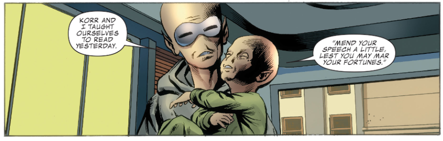 Then it’s back to HQ, where we catch up with the Moloids. Turg, who has been reduced to a head in a jar, is their voice of reason. Korr and Tong have taught themselves to read English, while Mik is busy calculating a confluence that links the four cities. Oh boy, it’s going to be tough keeping these Moloids’ names straight.
