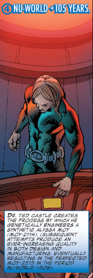 Then we cut back to Nu-World, which was originally a perfect recreation of Earth, only for all kinds of dystopian sci-fi stuff to happen there. Case in point, the next few pages take us further and further into Nu-World’s future, following its founder, Ted Castle, and the superheroes of that world and all the changes they go through over 300 years. Your guess is as good as mine by this point.